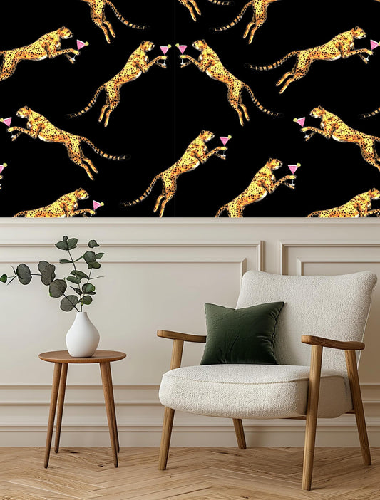 Cocktail Cheetah Black Wallpaper, Whimsical Jungle Peel and Stick Wallpaper, Exotic party Animals Wall Mural with drinks, conversational