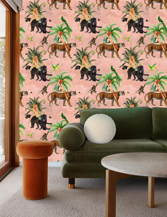 Jungle Walk Pink Vintage Wallpaper, Safari animal wall paper unique , monkey, tiger print peel and stick , unique retro wall coverings