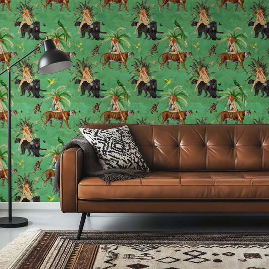 Jungle Walk Green Vintage Wallpaper, statement wall paper, vibrant bold paper feature walls, tropical exotic animals maximalist wall decor