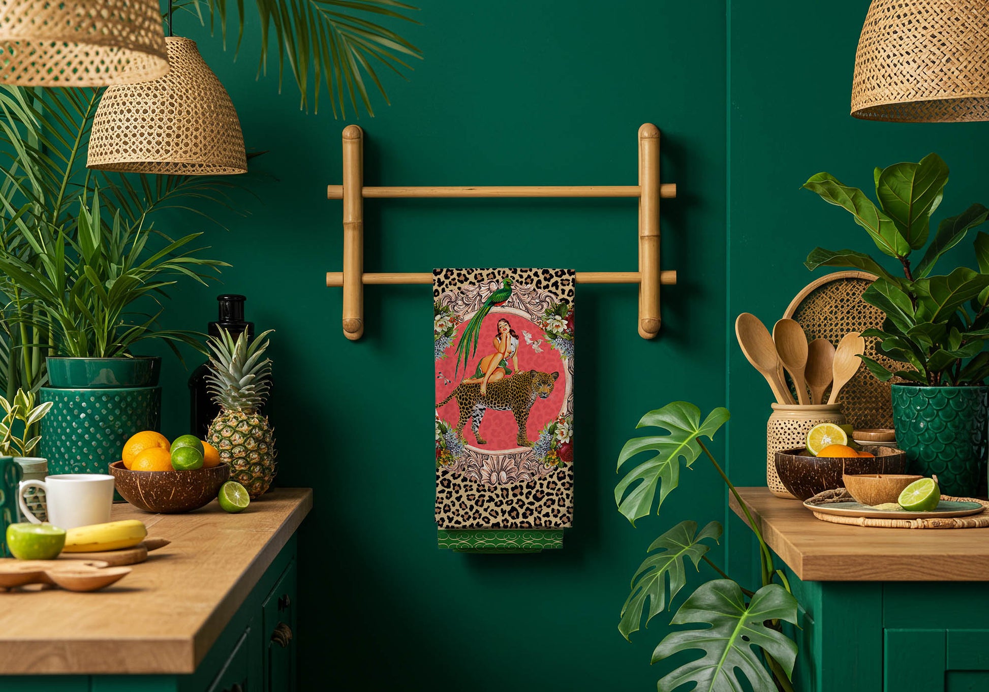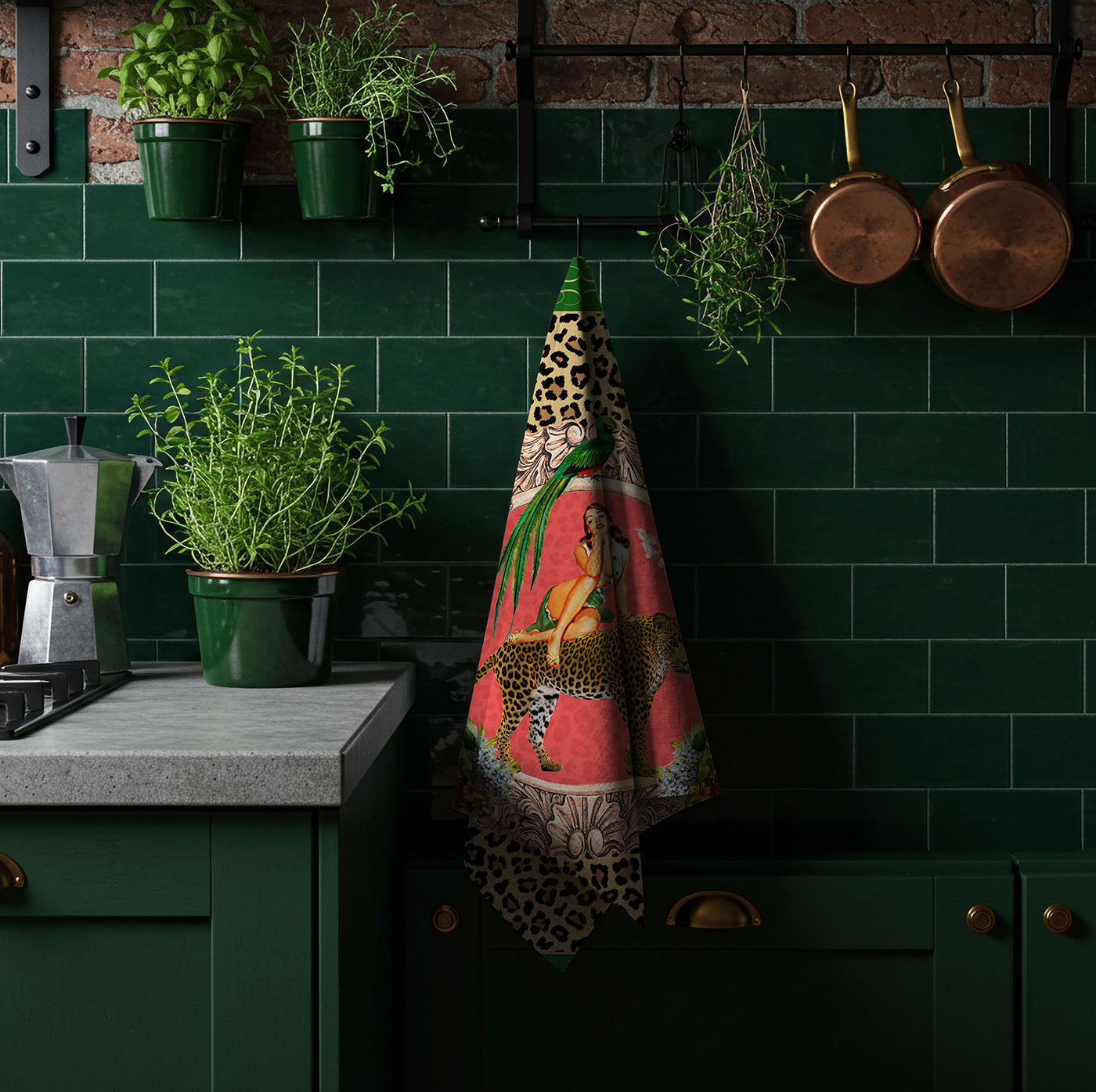 Step into Queen K’s world of bold colour and unapologetic charm with the Alice Linen Tea Towel — a lavish art piece disguised as a kitchen essential.
