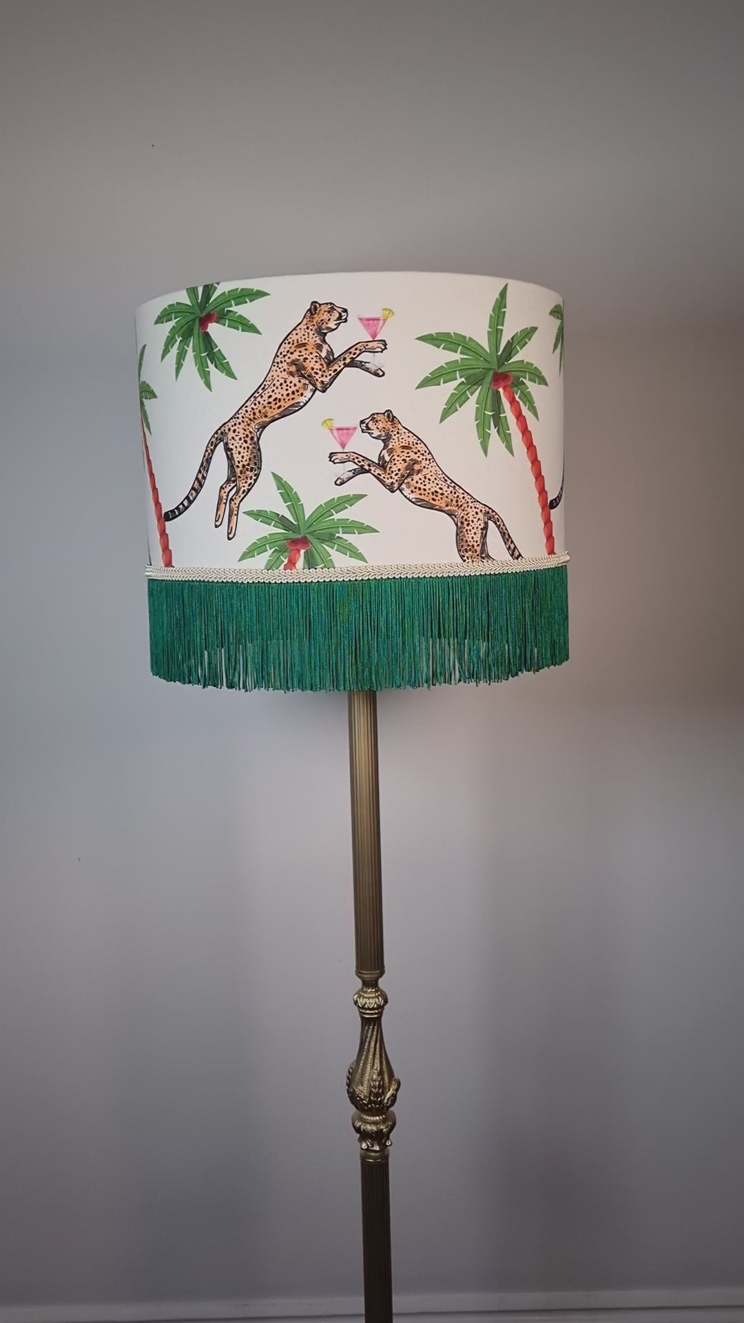 Twin cheetahs Trixie and Buttercup are at it again, sipping on tropical pink cocktails in the lush jungle, toasting a joyous life well lived!. Fresh and understated, the ivory colourway will be fabulous in any decor, modern or vintage,minimal or maximal and everything in between. Place the Cocktail Cheetah Fringed Drum Lampshade Ice Dream in your favourite space, and let it become the conversation piece that brings smiles and admiration. Trixie, Buttercup and their pink cocktails are here to remind you that every day can be a wonderful celebration of style and whimsy. Available in 2 sizes 30cm diameter x 29cm height with fringe 40cm diameter x 33cm height with fringe