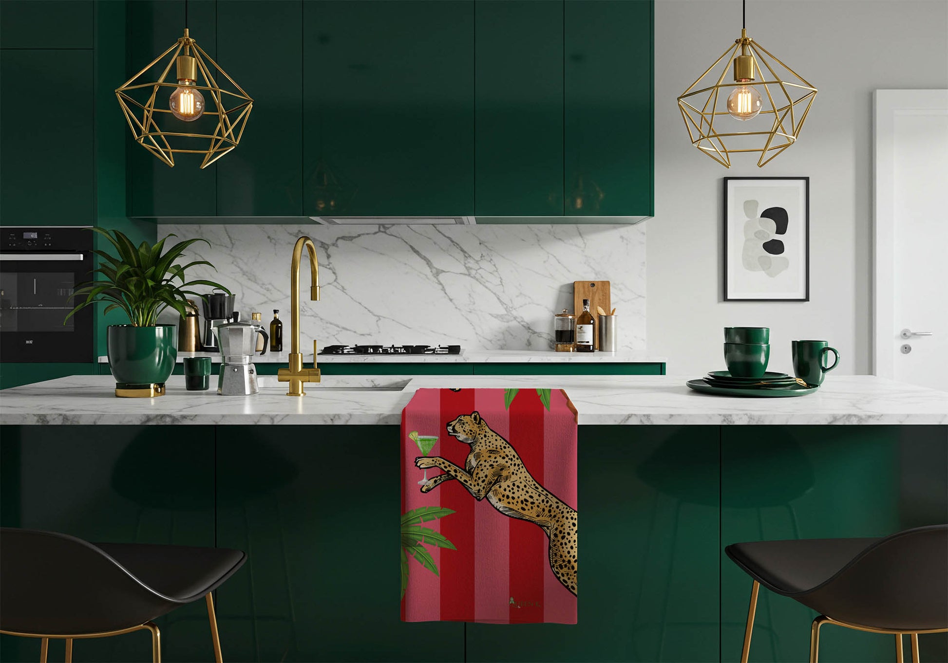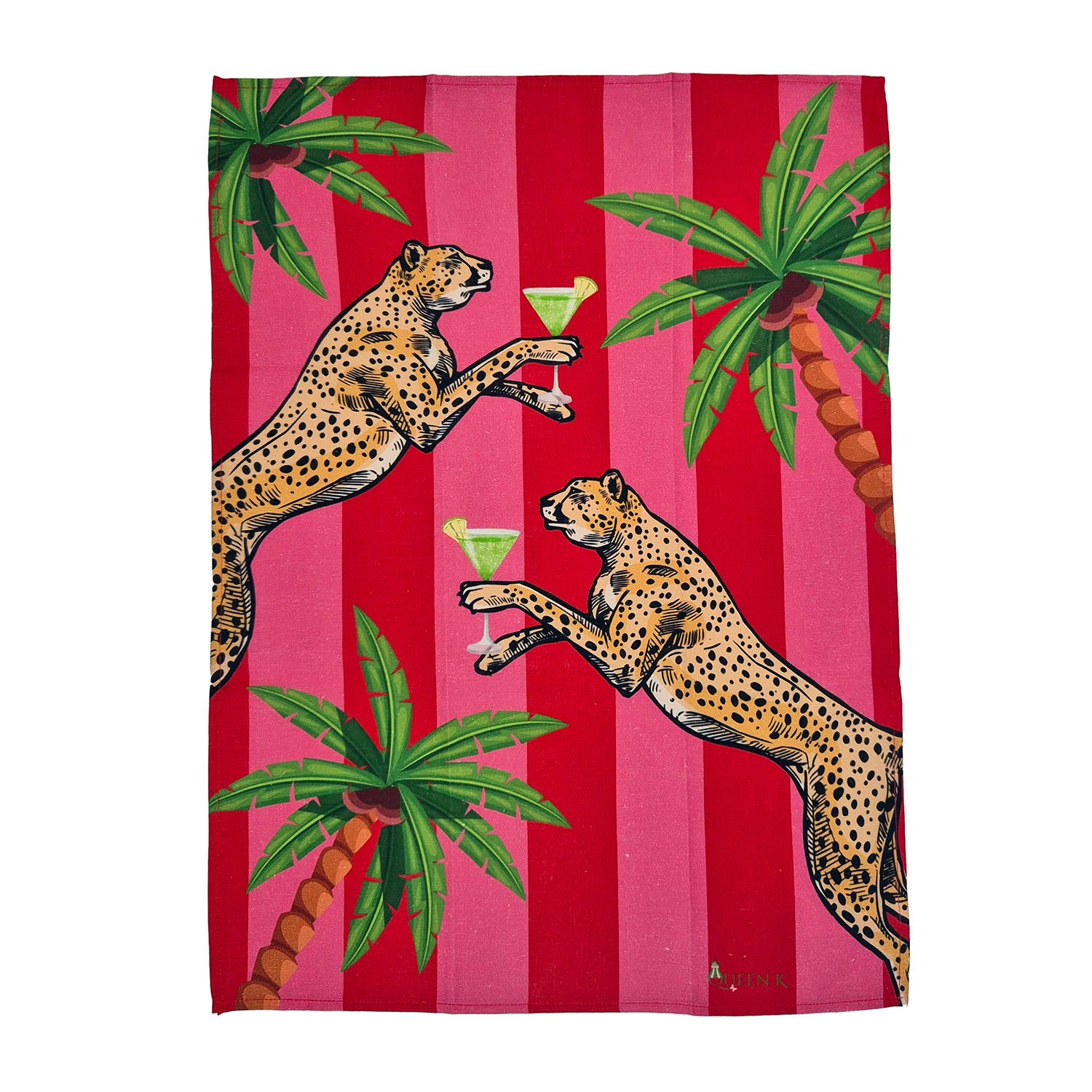 Meet the Cocktail Cheetah Tea Towel, where everyday kitchen style meets unapologetic glamour. Designed by Karen Hurley for the Queen K collection, this bold red-and-pink striped towel stars a pair of mischievous cheetahs sipping cocktails — the ultimate nod to maximalist fun and vintage-inspired indulgence.