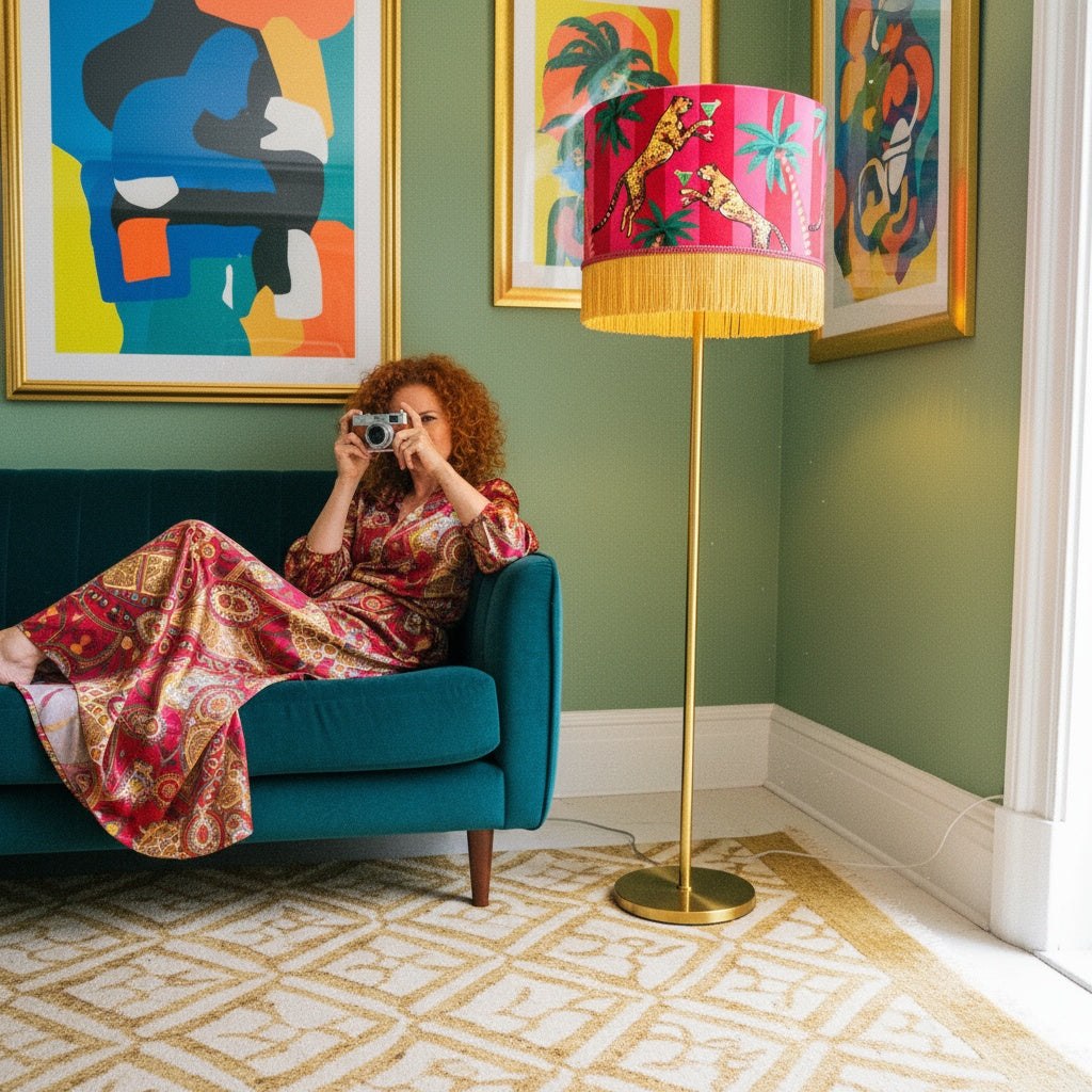 Style it with a vintage base or something modern for contrast-this lampshade works beautifully as a table or floor lamp, or even as a daring ceiling pendant for those unafraid to embrace bold interiors. Place it in your favourite space, and let it become the conversation piece that brings smiles and admiration. Trixie, Buttercup and their green cocktails are here to remind you that every day can be a wonderful celebration of style and whimsy. Available in 2 sizes 30cm diameter x 29cm height with fringe 40cm diameter x 33cm height with fringe
