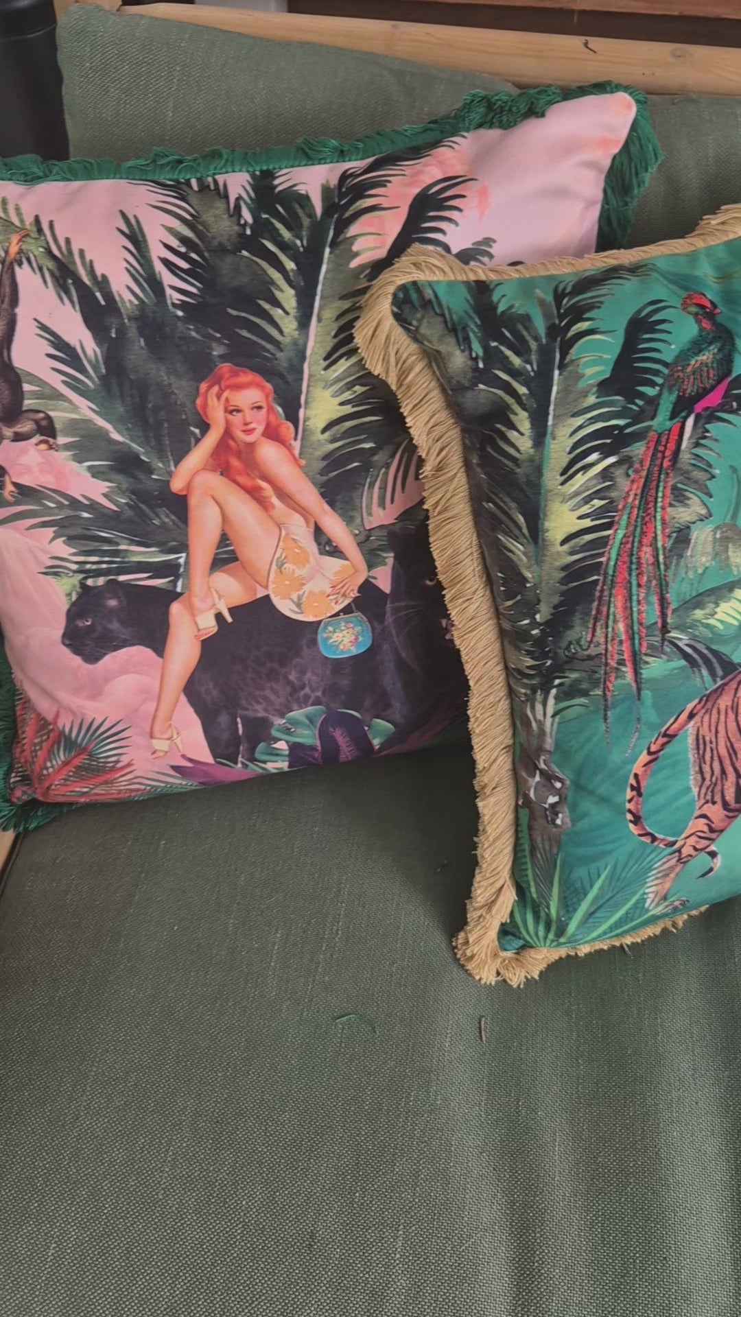 Every handmade jungle print cushion from Queen K is crafted with care in Australia. Skilled artisans create each cushion to ensure lasting quality. The print features lush green palm leaves, a playful monkey, a stunning retro lady and striking panthers. Turn it over and you will find another just as gorgeous print featuring a lady atop a tiger making it reversible and versatile. The playful scene is vintage-inspired with a modern eclectic twist.