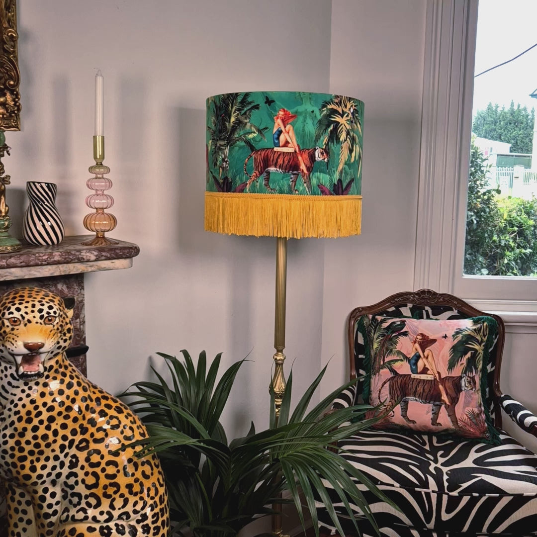 Step into a world of retro glamour and jungle mischief with the Jungle Walk Green Tassel Fringed Drum Lampshade. Featuring confident, carefree ladies riding atop majestic jungle animals in a lush tropical scene, this richly detailed design is printed on emerald green velvet and finished with luxurious vintage-style gold fringe.