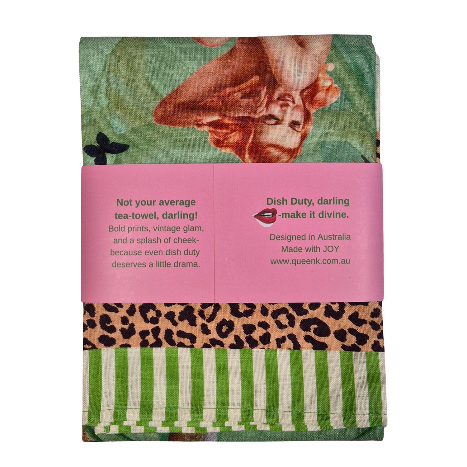 Linen you’ll want to show off, not tuck away. Queen K tea towels bring art, attitude, and a touch of cocktail hour to your kitchen.