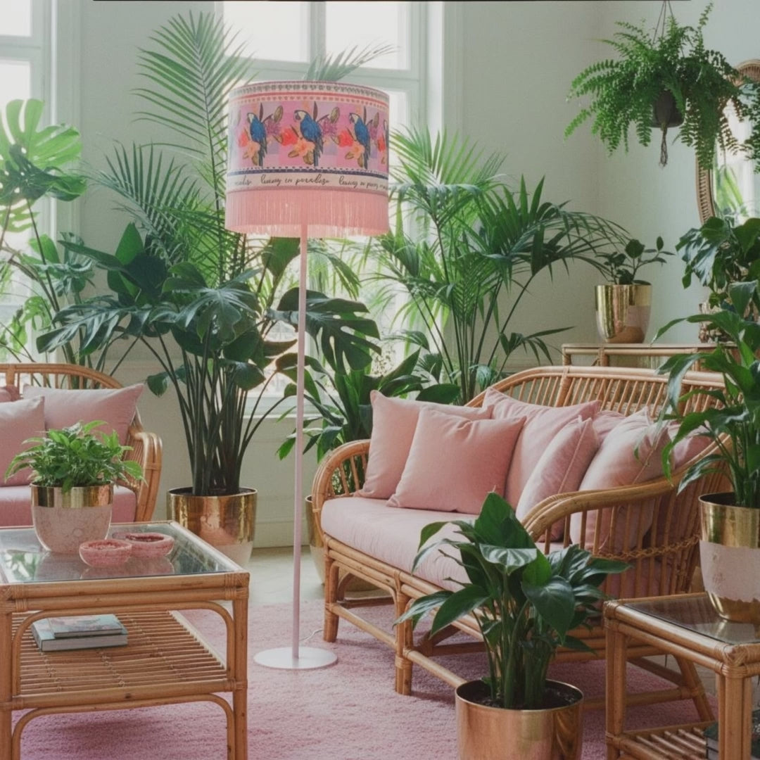 Bring the tropics home with our Living in Paradise lampshade — a celebration of colour, freedom and unapologetic joy. Blue parrots perch among lush hibiscus blooms, circling the shade in a painterly repeat that transports you straight to a sun-drenched island escape. Around the edge, the words “Living in Paradise” remind you that paradise is a state of mind — not just a place. Finished with a playful pink fringe, this statement shade is made for dreamers, travellers and lovers of bold interiors.