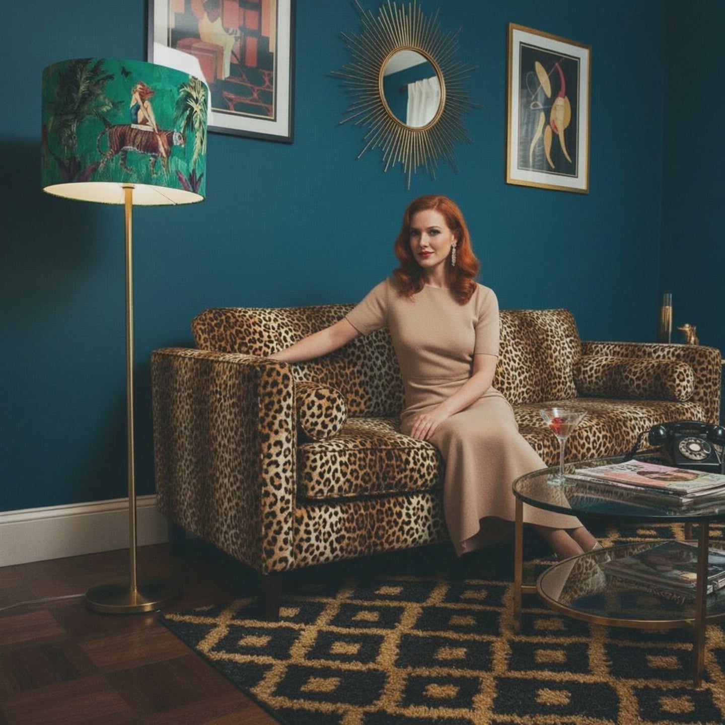 Step into a world of retro glamour and jungle mischief with the Jungle Walk Drum Lampshade Green. Featuring confident, carefree ladies riding atop majestic jungle animals in a lush tropical scene, this richly detailed design is printed on emerald green velvet and finished with a choice of white or gold inside liner.