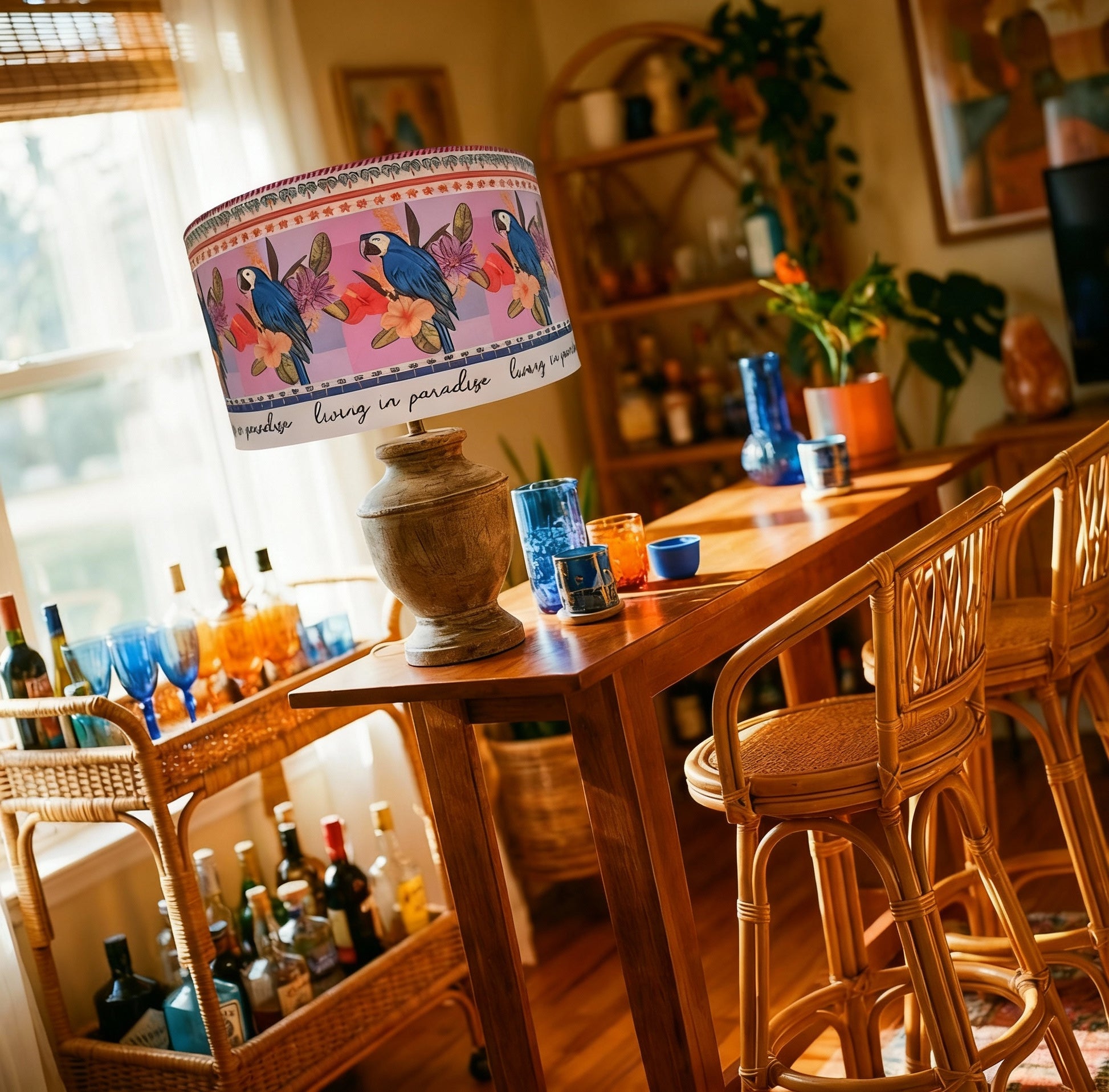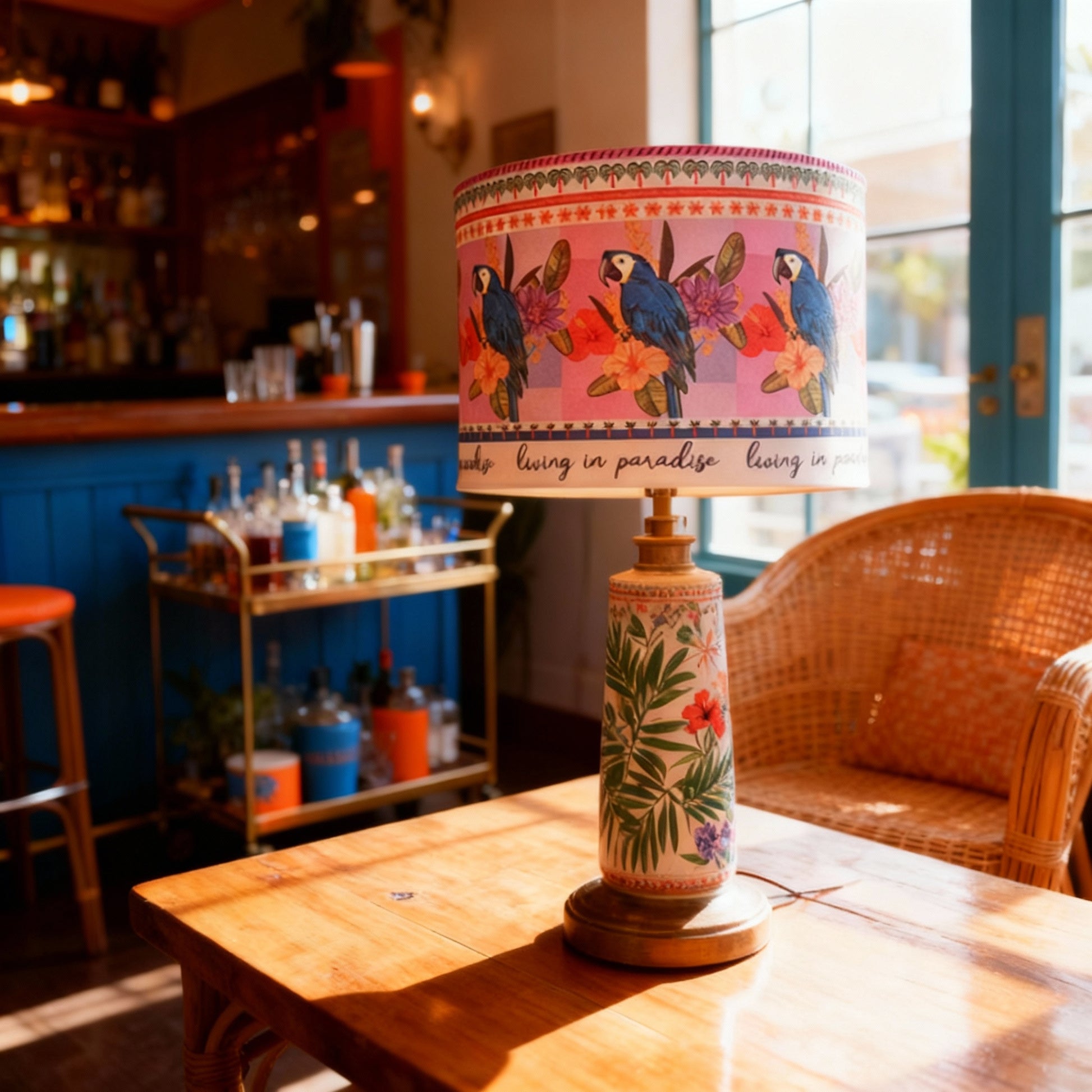Bring the tropics home with our Living in Paradise lampshade — a celebration of colour, freedom and unapologetic joy. Blue parrots perch among lush hibiscus blooms, circling the shade in a painterly repeat that transports you straight to a sun-drenched island escape. Around the edge, the words “Living in Paradise” remind you that paradise is a state of mind — not just a place.