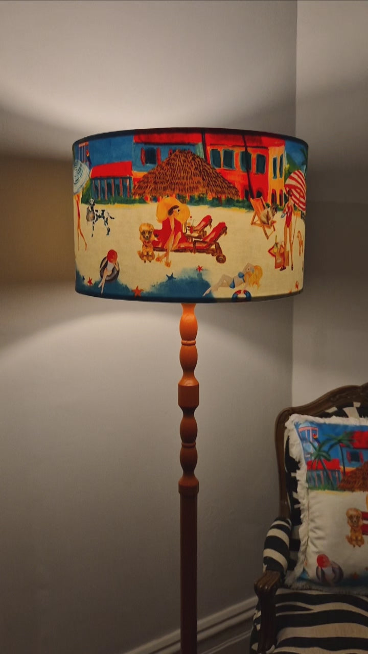 Transport your space to a sun-drenched Mediterranean escape with the Riviera Drum Lampshade. This exquisite print captures the effortless glamour of of stylish beachgoers and their adorable pooches, set against a dreamy coastal backdrop. Whether styled in a breezy seaside villa or as a statement piece in a city chic apartment, Riviera will bring the Mediterranean to you.