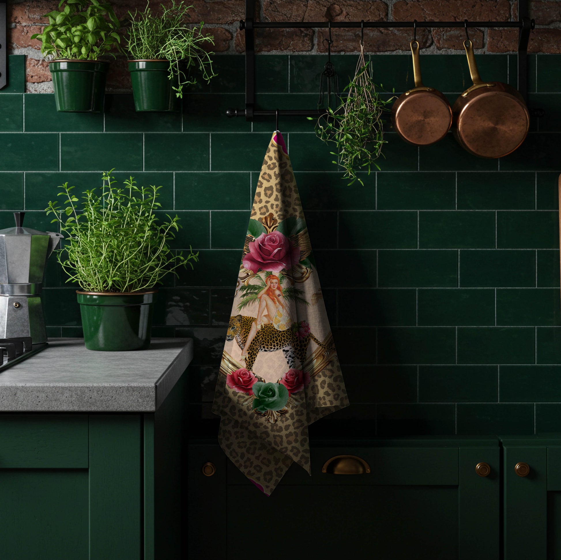 A fierce golden leopard struts through a heart-shaped vintage frame, carrying a glamorous retro muse draped in florals. Surrounded by lush roses, gilded details, and a bold leopard-print backdrop, this tea towel is pure maximalist fantasy.